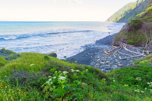 Once you’ve made it through and breathed a quick sigh of relief, you’ll find yourself on the downhill portion of the inland path, where you’ll arrive at a crossroads and have to determine which way leads to the Cooskie Creek Spur trail and which one leads to the Lost Coast Trail. Take a minute to find your bearings and ensure you’re on your planned route; you’ll know you’re on the correct path when you encounter an old, dilapidated shack and return to the sandy, pebbly beach. While the going is slow back on the sands, at mile five you’ll reach Randall Creek. Rejoice in knowing that the most strenuous portion of the day’s work is done; walk merely two miles more and you will find yourself south of Spanish Creek, a great place to stop for the night.